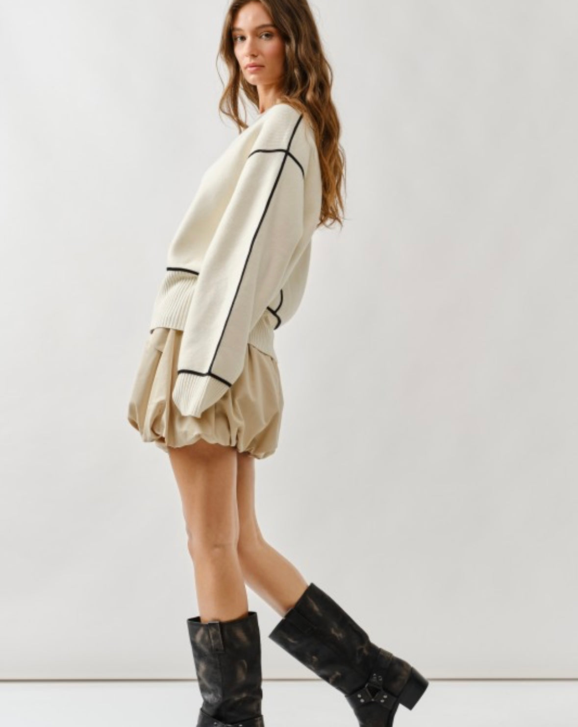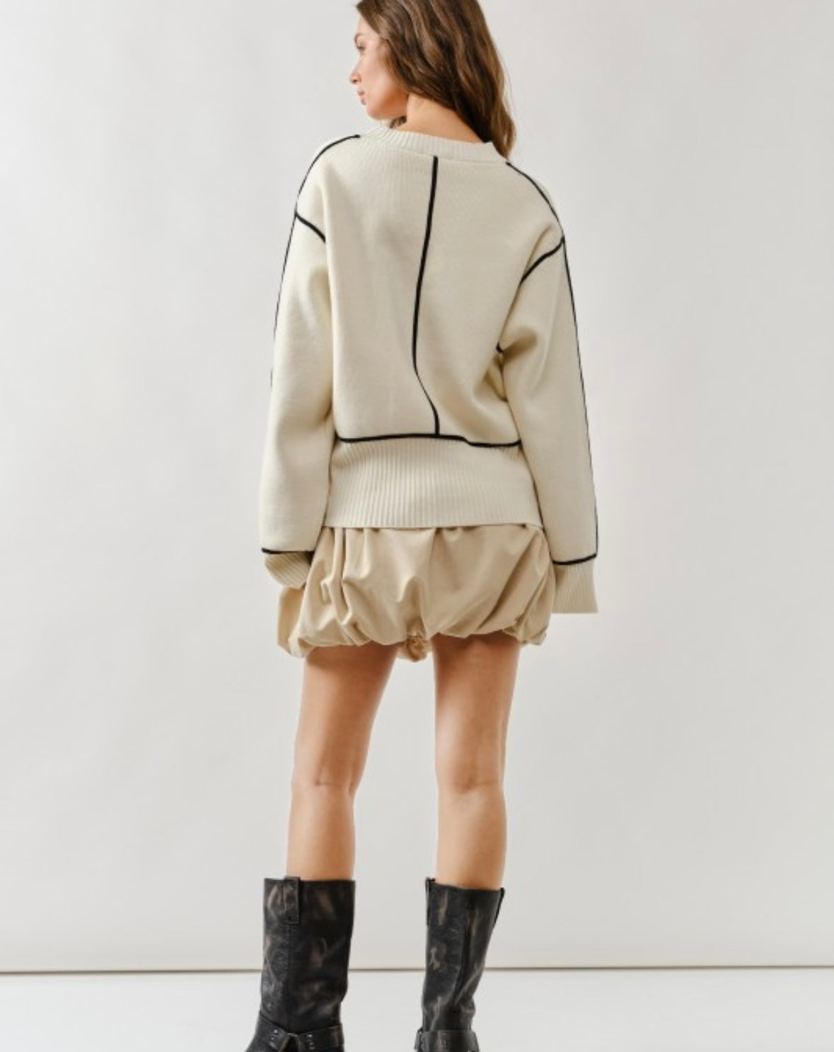 Bold contrast stitching traces the seams. This sweater brings a modern edge to everyday essentials.