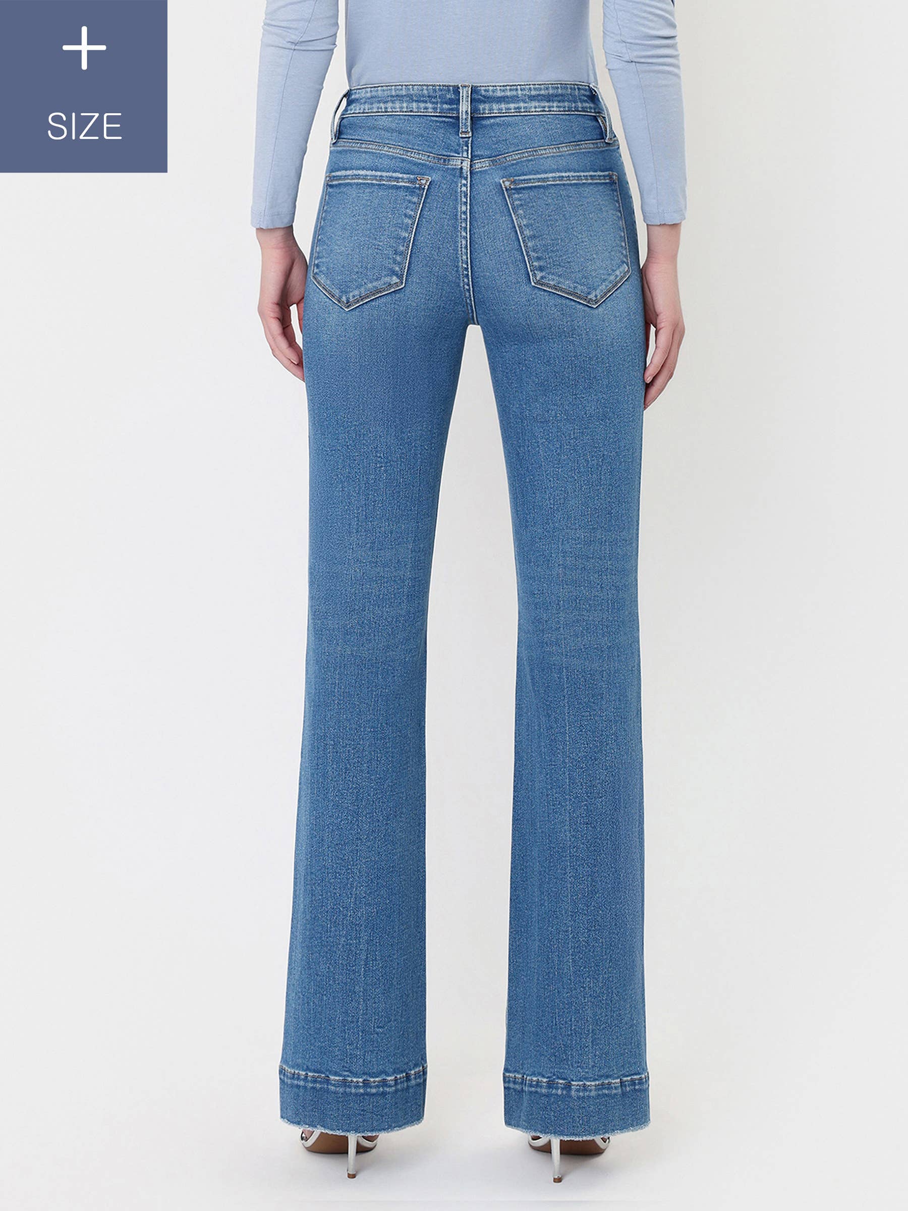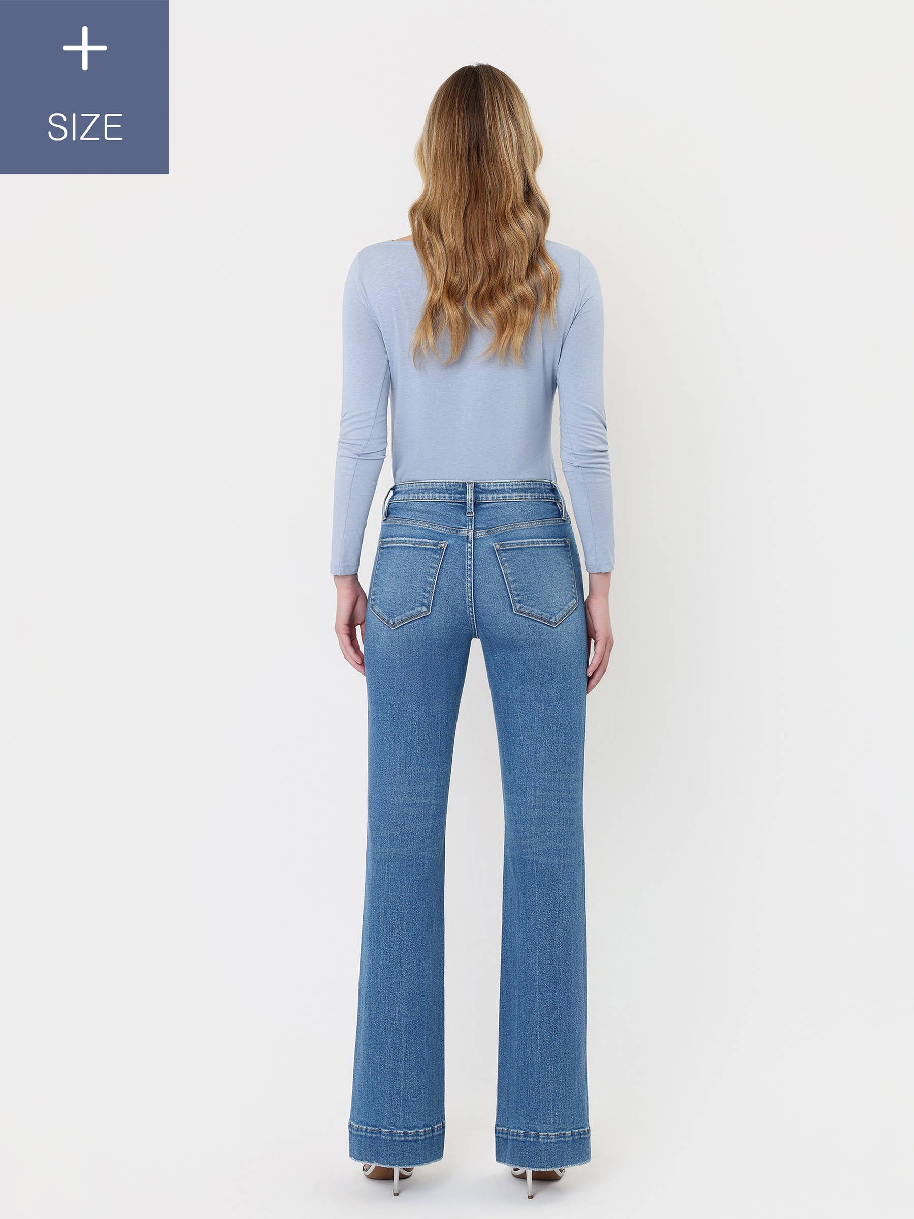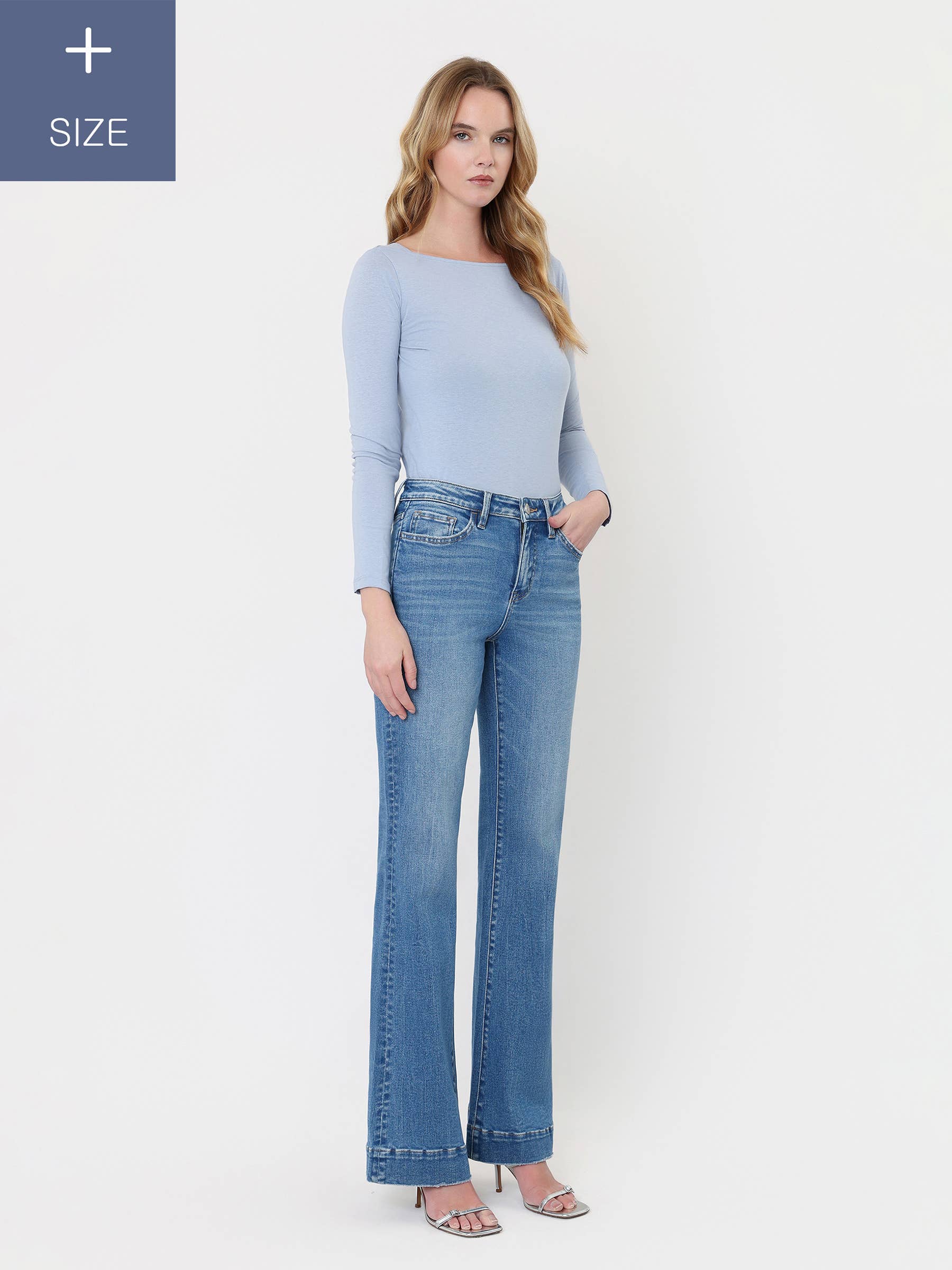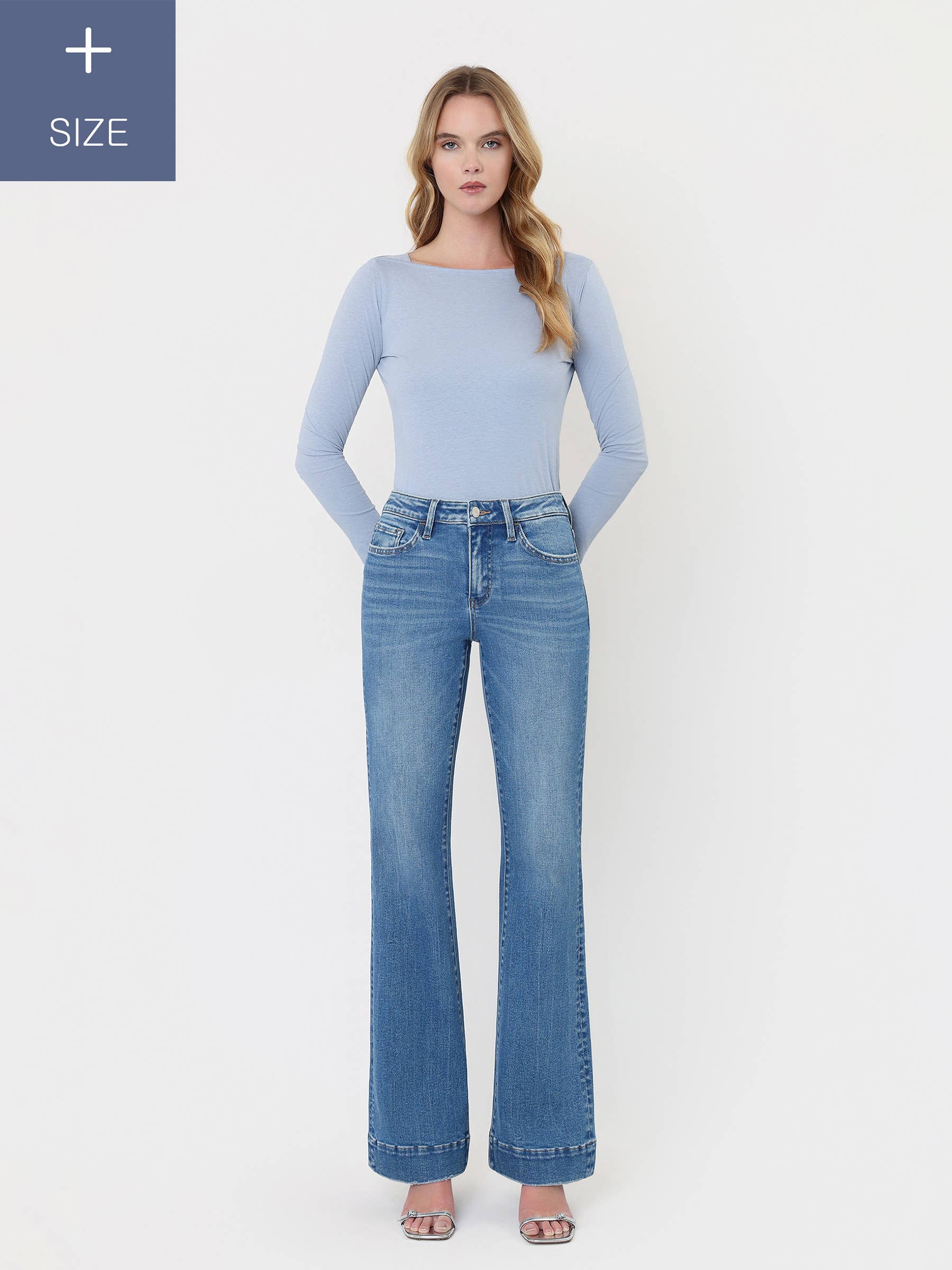 CURVY HIGH RISE TROUSER HEM RELAXED FLARE JEANS COMFORT STRETCH DENIM, HIGH RISE WAIST, 5 POCKETS, TROUSER HEM, FULL LENGTH, MEDIUM WASH, RELAXED FLARE JEANS